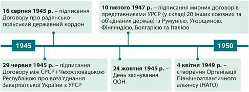 1. Установіть хронологічну послідовність подій повоєнних років: • останній обмін територіями УРСР із Польщею • створення Закарпатської області • заснування ООН, державою-засновницею якої була й Україна.