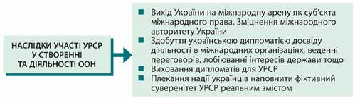 Проаналізуйте схему «Наслідки участі УРСР у створенні та діяльності ООН». • 1. У чому відмінність між поняттями «країна» і «держава»? Чи впливала зовнішньополітична діяльність на зміну статусу УРСР? • 2. Підтвердьте кожну тезу конкретними фактами. • 3. Які тези вважаєте суперечливими? У чому виявляються ці суперечності?