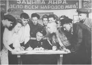 Збір підписів під відозвою Постійного комітету Всесвітньої ради миру про заборону атомної зброї. Київ. 1950 р.