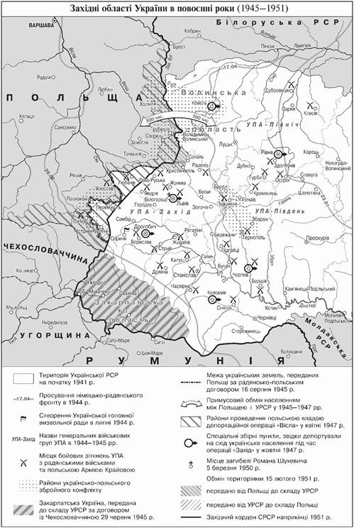 3. Покажіть на карті події, що відбувалися в повоєнний період на західноукраїнських землях. Установіть причиново-наслідкові зв'язки між зазначеними подіями.