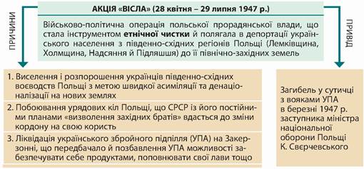 Операція «Вісла» розпочалася 28 квітня 1947 р. Шість дивізій Війська Польського заблокували українські села, а частини прикордонних військ НКВС і чехословацької прикордонної служби перекрили кордон на сході та півдні Польщі. Упродовж наступних трьох місяців у західні та північні воєводства з теренів Закерзоння (українських етнічних земель Надсяння, Лемківщини, Холмщини й Підляшшя) було депортовано понад 140 тис. українців. До кінця 1947 р. вивезли ще понад 10 тис. осіб.