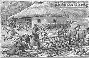Вивіз на Сибір у 1947-му. Листівка УПА. Дереворит Н. Хасевича
