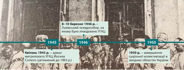 1 листопада 1944 р. помер митрополит Андрей Шептицький, який мав серед населення Східної Галичини безмежний авторитет. Це полегшило задуману Сталіним ліквідацію греко-католицької церкви. Духовенству й вірянам було запропоновано злитися зі штучно створеною Сталіним Російською православною церквою. Коли вищі ієрархи УГКЦ відмовилися розглянути таку пропозицію, за справу взялися органи державної безпеки. Новопризначеного митрополита Йосипа Сліпого у квітні 1945 р. заарештували з усім єпископатом УГКЦ за звинуваченням у «ворожій діяльності проти УРСР, співпраці з німецько-фашистськими окупантами». У березні 1946 р. усіх засудили на великі терміни ув’язнення в таборах віддалених регіонів СРСР.