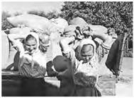 Колгоспниці колгоспу ім. В. Леніна розвантажують хліб на пункті заготзерна. Бровари, Київська обл. 1946 р.