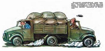 Текст до карикатури: машина для зустрічних перевезень. «Вінницький суперфосфатний завод вивозить свою продукцію на Полтавщину, Сумщину, Харківщину і навіть на Північний Кавказ, а суперфосфат з Костянтинівського хімзаводу (Донбас) завозиться на Вінниччину». Сатирично-гумористичний журнал «Перець». 1956 р.