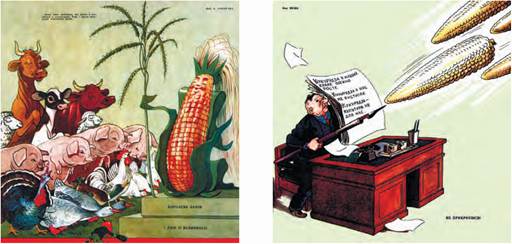 Текст до карикатур: 1. «Нема такої культури, яка могла б рівнятися з кукурудзою. Тому і звуть кукурудзу королевою ланів». «Королева ланів і двір її величності». 2. «Кукурудза в наших краях погано росте. Кукурудза в нас не вистигає. Кукурудза — культура не для нас». «Не прикриєшся»