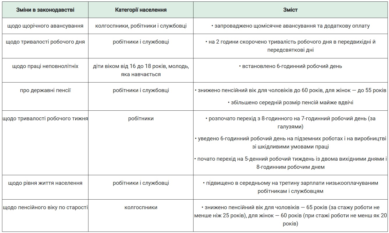 Було скасовано закони 1940 р. про заборону змінювати на власний розсуд місце роботи і про суворі покарання за запізнення на роботу та прогули. Для селян, однак, зберігалися попередні умови: не маючи паспортів, вони не могли залишити свій колгосп або радгосп. Утратив силу закон про примусовий (мобілізаційного характеру) набір у ремісничі училища дітей, які закінчили семирічку. Було скасовано плату за навчання в старших класах середніх шкіл та вищих навчальних закладах. Збільшено тривалість відпусток, пов’язаних із вагітністю і пологами (із 77 до 112 календарних днів).