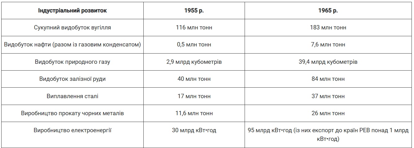 Прискорено розбудовували Криворізький залізорудний басейн. Залізну руду добували в шахтах, а також у кар’єрах, тобто відкритим способом, що виявився найекономнішим. У 1955 р. став до ладу найбільший у Європі Південний гірничо збагачувальний комбінат. За видобутком залізної руди Україна посідала друге місце у світі після США, а за видобутком марганцевої руди (4,7 млн тонн у 1965 р.) впевнено утримувала перше місце.