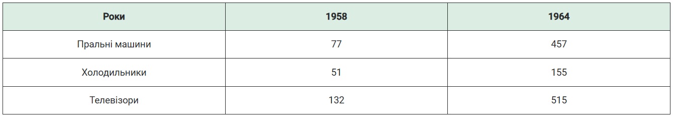 Поліпшилося постачання населення товарами широкого вжитку. У побут входили швейні та пральні машини, холодильники й телевізори. Спочатку цих товарів виробляли недостатньо, щоб забезпечити мешканців республіки. Однак поступово їх виробництво збільшувалося.