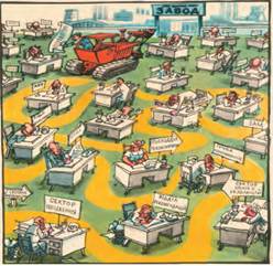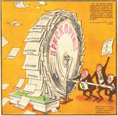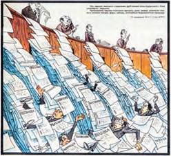 Текст до карикатури: «Час нарешті покінчити з практикою дріб’язкової опіки підприємств з боку міністерств і відомств. Прискоренню науково-технічного прогресу дуже заважає величезна кількість усіляких паперів, форм, таблиць, непотрібних бюрократичних процедур (із матеріалів XXVIІ з’їзду КПРС)»