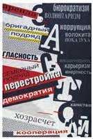 Текст на плакаті (російською мовою). На білому тлі: «Оренда; бригадний підряд, гласність; сімейний підряд; перебудова; демократія; госпрозрахунок; кооперація». На чорному тлі: «Бюрократизм; волюнтаризм; корупція; тяганина; показуха; некомпетентність; кар’єризм; інертність; хамство; застій»