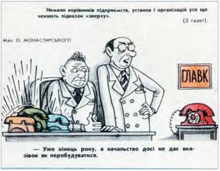 Текст до карикатури: «Усі ми знаємо, скільки шкоди завдають численні обмеження та інструкції. Це “продукція” людей, які, подібно до одного літературного персонажа, кожного ранку “ходять у посаду”, а прискорення розуміють, як механічне пришвидшення колообігу паперів (з виступу на XXVIІ з’їзді КПРС)»