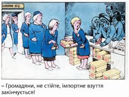 «...З прилавків магазинів один за одним зникали промислові та продовольчі товари. Люди скуповували все підряд. Склалася ситуація, коли населення чи не вперше отримало на руки більшу кількість готівки. Та не було товару, який би можна було за неї купити. У 1990 р. практично все стало дефіцитом. Гонитва за товарами в цих умовах витісняла всі інші цілі, людина перебувала в постійному напруженні.