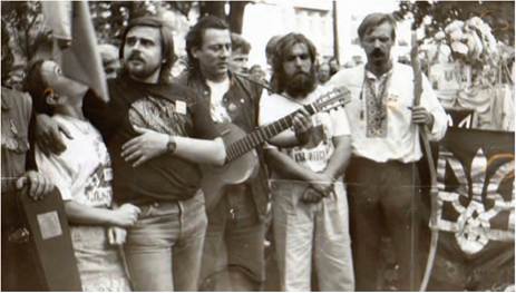 Під час фестивалю «Червона рута», Чернівці. 1989 р. На фото (зліва направо): співаки Андрій Панчишин, Віктор Морозов, Василь Жданкін і громадський діяч Юрій Волощак