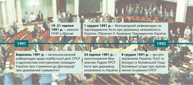 Через тиждень після українського референдуму, 8 грудня 1991 р., президент Російської Федерації Б. Єльцин, Президент України Л. Кравчук і голова Верховної Ради Білорусі С. Шушкевич зібралися в Біловезькій Пущі під Мінськом і заявили, що СРСР як суб’єкт міжнародного права та геополітична реальність припиняє існування. Було підписано угоду про створення Співдружності Незалежних Держав (СНД). За цих обставин М. Горбачов оголосив про припинення виконання ним функцій президента СРСР у зв’язку зі зникненням самої держави.