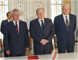 Президент України Л. Кравчук, голова Верховної Ради Білорусі С. Шушкевич і президент Росії Б. Єльцин під час підписання Біловезької угоди