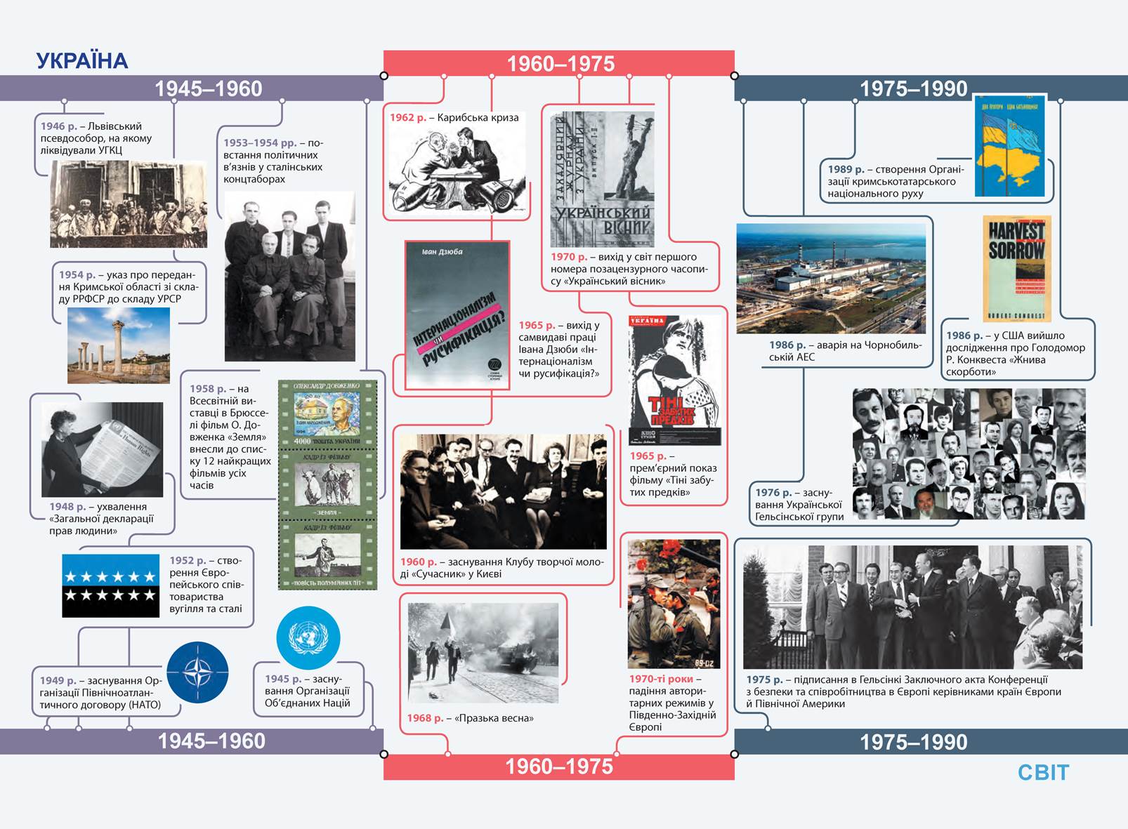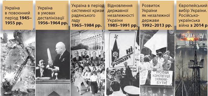 Україна в повоєнний період (1945—1955). Цей період увійшов у новітню історію як час повоєнної відбудови. Друга світова війна завдала величезних втрат продуктивним силам України й супроводжувалася колосальними жертвами. Водночас її важливим наслідком стало возз’єднання українських земель, здійснене завдяки рішенням глав провідних держав антигітлерівської коаліції. З огляду на вагомий внесок у розгром нацистської Німеччини та її союзників Україна стала спів засновницею Організації Об’єднаних Націй (ООН) — міжнародної організації, створеної з метою збереження миру та розвитку співпраці між народами. Економіку України відбудовували в надзвичайно складних умовах — внутрішніх і міжнародних. Ситуація погіршувалася через масовий голод 1946—1947 рр. Водночас розгорталася «холодна війна» між учасниками антигітлерівської коаліції. Сталінський Радянський Союз вдався до наступальної політики в Європі та Азії, прагнучи нав’язати свій суспільно-політичний устрій і соціально-економічний лад багатьом країнам. З цією метою витрачалися величезні кошти на створення ракетно-ядерної зброї. Україна, як і в довоєнні часи, перебувала в епіцентрі сталінських репресій. Особливо жорсткого тиску зазнали західні області, які методами партизанської війни опиралися «радянізації».