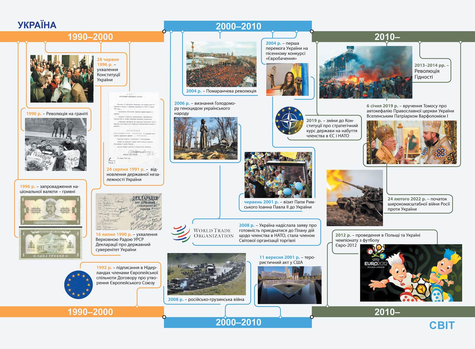 Європейський вибір України. Російсько-українська війна (з 2014 р.) — це сучасність. У наші дні події в Україні вперше стали предметом постійного інтересу з боку світових політиків і засобів масової інформації. Виявилося, що «холодна війна» не поставила остаточної крапки в протистоянні між сучасними демократіями та вчорашніми імперіями. Російська Федерація, так само як колись Радянський Союз, прагне утвердити себе впливовою наддержавою, використовуючи одержану від радянського минулого ракетно-ядерну зброю й незаконно посівши місце в постійному складі Ради Безпеки ООН. Чимдалі більшу загрозу своїй незалежності відчувають усі країни вздовж її кордонів (за винятком Китаю).