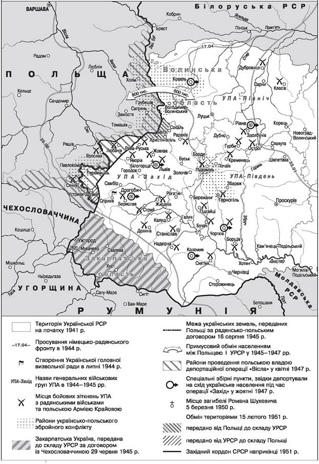 3. Покажіть на карті події, що відбувалися в повоєнний період на західноукраїнських землях. Установіть причиново-наслідкові зв’язки між зазначеними подіями.
