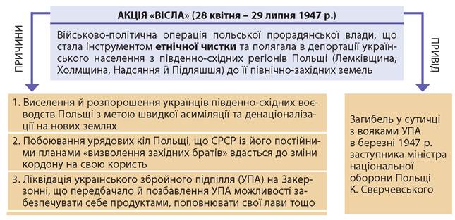• Акція «Вісла» — єдина депортація середини XX ст., виконана як помста за національно-визвольну боротьбу із застосуванням колективної відповідальності (кожного українця трактували як націоналіста, співучасника УПА).
