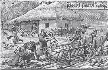 Вивіз на Сибір у 1947-му. Листівка УПА. Дереворит Н. Хасевича