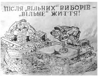 Проаналізуйте візуальні джерела. • 1. Яким історичним явищам присвячено листівки? • 2. Що роблять зображені на них персонажі? • 3. Яке ставлення до події намагався сформувати художник у глядачів? • 4. Поміркуйте, чому окупаційна влада будь-що прагне провести на окупованих територіях вибори. Наведіть інші приклади подібних дій в історії.