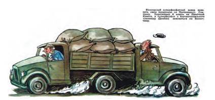 Текст до карикатури: машина для зустрічних перевезень. «Вінницький суперфосфатний завод вивозить свою продукцію на Полтавщину, Сумщину, Харківщину і навіть на Північний Кавказ, а суперфосфат з Костянтинівського хімзаводу (Донбас) завозиться на Вінниччину». Сатирично-гумористичний журнал «Перець». 1956 р.