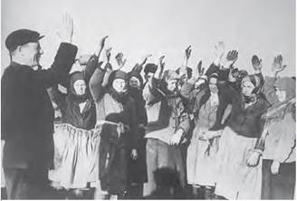 Проаналізуйте візуальне джерело. • 1. Навіщо влада ініціювала такі заходи? • 2. Чому в зібранні беруть участь тільки жінки? • 3. Про що свідчить одяг зображених? • 4. Які висновки можна зробити на підставі фотодокумента про стан розвитку сільського господарства і життя селян на початку 1960-х років?
