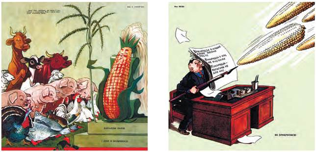 Текст до карикатур: 1. «Нема такої культури, яка могла б рівнятися з кукурудзою. Тому і звуть кукурудзу королевою ланів». «Королева ланів і двір її величності». 2. «Кукурудза в наших краях погано росте. Кукурудза в нас не вистигає. Кукурудза — культура не для нас». «Не прикриєшся»