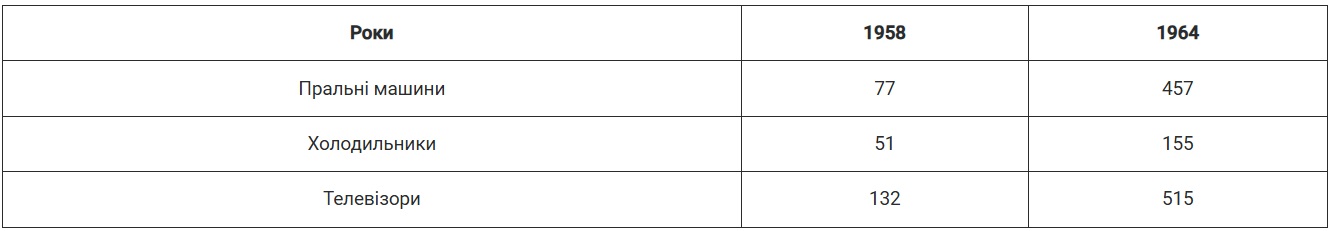 Поліпшилося постачання населення товарами широкого вжитку. У побут входили швейні та пральні машини, холодильники й телевізори. Спочатку цих товарів виробляли недостатньо, щоб забезпечити мешканців республіки. Однак поступово їх виробництво збільшувалося.