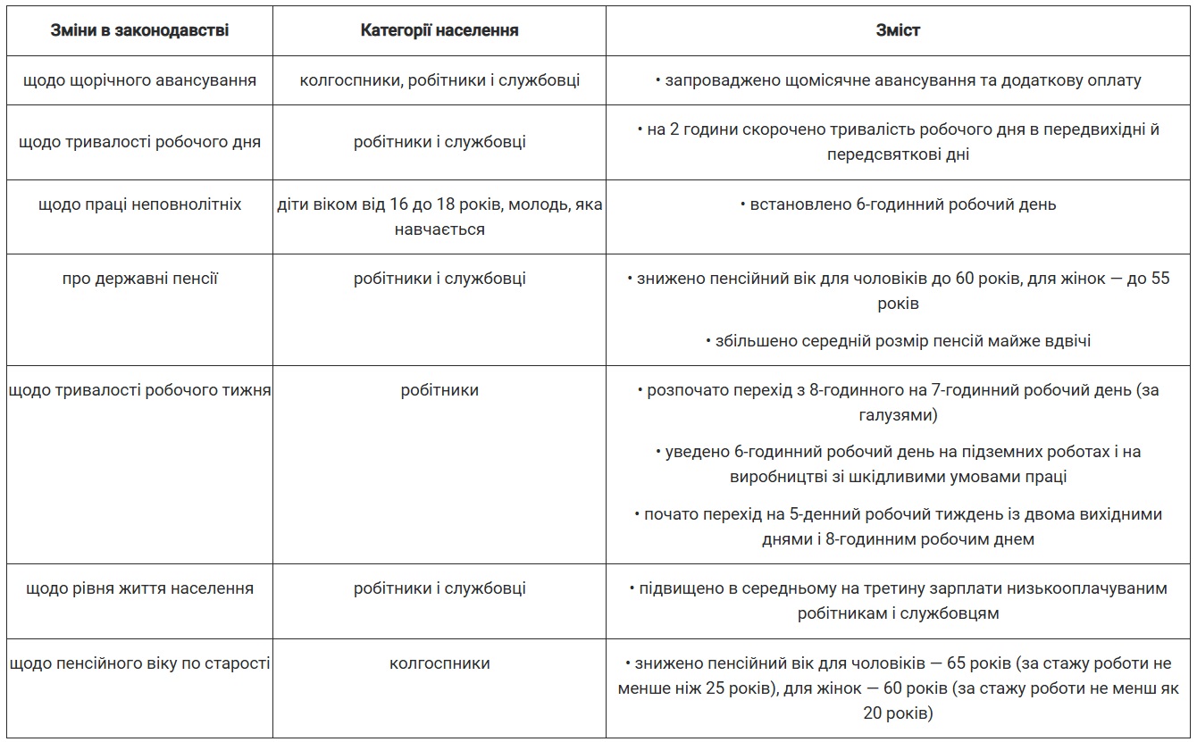 • Закріплення робітників і службовців за підприємствами та установами і заборона населенню вільно вибирати місце праці. • Запровадження гарантованої оплати праці в колгоспах. • Здійснення грабіжницької для населення грошової реформи. • Істотне подовження відпусток у зв’язку з вагітністю і пологами. • Оптимізація пенсійного законодавства. • Переорієнтація частини потужностей галузей важкої промисловості на виготовлення товарів народного вжитку. • Різке погіршення житлових умов міського населення. • Скорочення тривалості робочого дня з переходом на п’ятиденний робочий тиждень восьмигодинного робочого дня. • Упровадження плати за навчання у старших класах середніх шкіл та у вищих навчальних закладах.