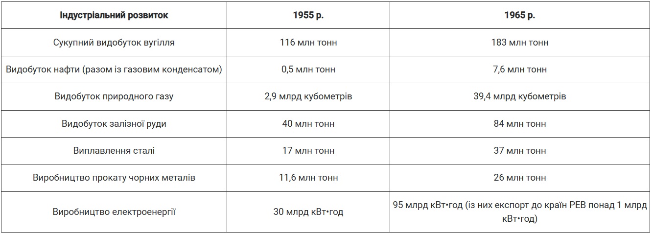 Прискорено розбудовували Криворізький залізорудний басейн. Залізну руду добували у шахтах, а також у кар’єрах, тобто відкритим способом, що виявився найекономнішим. У 1955 р. став до ладу найбільший у Європі Південний гірничо збагачувальний комбінат. За видобутком залізної руди Україна посідала друге місце у світі після США, а за видобутком марганцевої руди (4,7 мли тонн у 1965 р.) впевнено утримувала перше місце.
