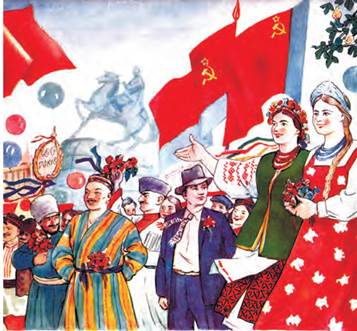 Проаналізуйте візуальне джерело. • 1. Розкрийте символічний зміст зображення. • 2. Чому персонажі малюнка одягнені в національні костюми? • 3. Що символізує постать центрального персонажа, одягненого інакше? • 4. Чому на задньому плані зображено пам’ятник Б. Хмельницькому в Києві? • 5. З якою метою сатирично-гумористичний журнал «Перець» опублікував у 1954 р. ілюстрацію? • 6. Чи є підстави вважати малюнок сатиричною карикатурою? Як можна визначити його жанр?