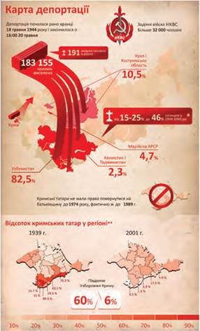 Наслідки депортації кримськотатарського народу 1944 р. Інфографіка із сайту Консульства України в Единбурзі: https://edinburgh.mfa.gov.ua/storage/app/sites/86/imported_content/5df3d0728f330.png