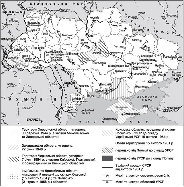 Проаналізуйте карту. Які зміни адміністративно-територіального устрою УРСР у повоєнному десятилітті вона відображає? З огляду на зміст карти сформулюйте якомога більше запитань; запропонуйте їх іншим групам і вислухайте відповіді.
