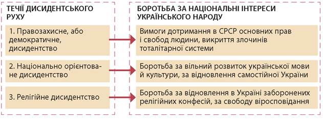 Проаналізуйте схему. Поміркуйте, ким репрезентовано течію правозахисного дисидентства. Якими подіями та явищами спричинено появу релігійного дисидентства?