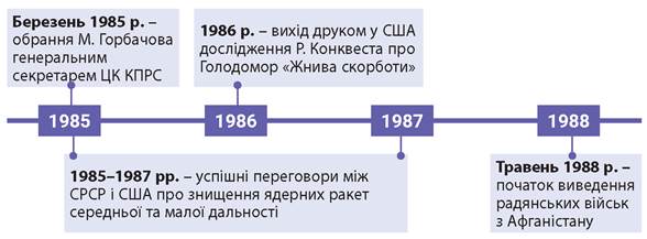 Через щодалі глибші кризові явища керівництво Радянського Союзу змушене було лібералізувати політичний режим значно активніше й системніше, ніж це робив М. Хрущов на зламі 1950—1960-х років. Реформи нового керівника держави М. Горбачова почалися під гаслами «перебудови», «нового мислення» та гласності. Однак система, вибудувана вождями КПРС, не надавалася до реформування. Навіть більше — лібералізація режиму лиш прискорювала його розвал. Центральна влада втрачала контроль над суспільно-політичними процесами. Перед Україною постала перспектива досягнення свободи й незалежності.