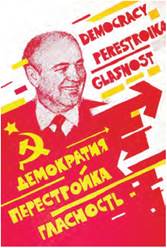 Радянський плакат часів «перебудови». Напис (російською та англійською мовами): «Демократія. Перебудова. Гласність»