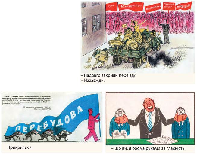 Проаналізуйте візуальні джерела. • 1. Чому представники номенклатури чинили опір «перебудові» і гласності? У чому цей опір виявлявся? • 2. Як художники зобразили особливості тогочасного суспільно-політичного життя? Чому пропагандистські видання публікували такі карикатури? • 3. Поясніть, як ви розумієте поняття подвійних стандартів у сфері суспільної моралі. Чому поява подвійних стандартів свідчила про глибоку кризу суспільної моралі й соціального життя в УРСР?