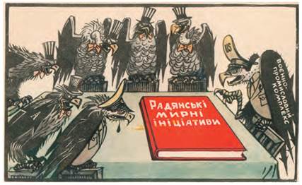 Проаналізуйте візуальне джерело. • 1. Які деталі свідчать про невідповідність проголошеного М. Горбачовим «нового мислення» в зовнішній політиці та пропаганди всередині СРСР? Чи випадкова ця невідповідність? • 2. Як можна пояснити появу таких карикатур у тогочасній пресі? Чому пропагандисти й далі приховували від людей справжні причини зміни зовнішньополітичного курсу в СРСР?