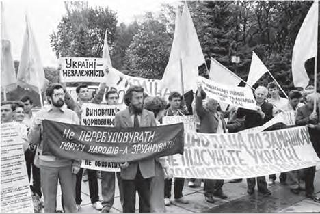 Проаналізуйте візуальне джерело. • 1. Які гасла на транспарантах свідчать про обстоювання пікетувальниками ідеї незалежності України? • 2. Унаслідок яких обставин суспільно-політичного життя в УРСР стало можливим швидке поширення цієї ідеї?