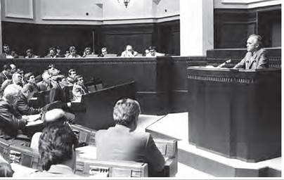 Зал засідань Верховної Ради УРСР під час ухвалення Декларації про державний суверенітет України. Виступає голова Ради Міністрів УРСР В. Масол. Київ, 16 липня 1990 р.