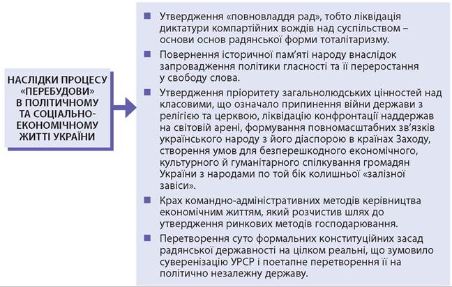 «З часом трансформувалася суть перебудови. Загальні вибори на альтернативній основі; гарантування свободи друку; розвиток багатопартійності; розширення прав трудових колективів; розмежування функцій партійних і державних органів; утвердження в суспільстві спочатку ідейного, а невдовзі й політичного плюралізму; законодавче оформлення економічної свободи; розширення прав союзних та автономних республік наближали крах тоталітарної системи...» (український історик Олег Бойко).