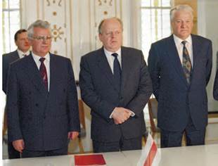 Президент України Л. Кравчук, голова Верховної Ради Білорусі С. Шушкевич і президент Росії Б. Єльцин під час підписання Біловезької угоди