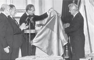 Президент УНР в екзилі Микола Плав’юк передає державні атрибути УНР Президентові України Л. Кравчуку. Серпень 1992 р. Фото: ukrinform.ua