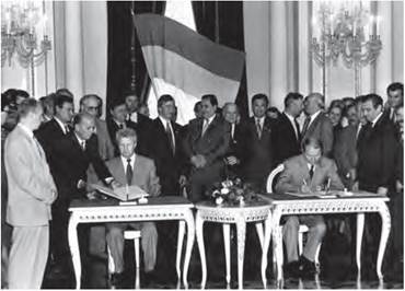 Підписання Конституційного договору між Верховною Радою України і Президентом України. Голова Верховної Ради України О. Мороз (ліворуч) і Президент України Л. Кучма (праворуч)
