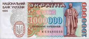 Купюра в 1 мільйон українських купонокарбованців. 1995 р.