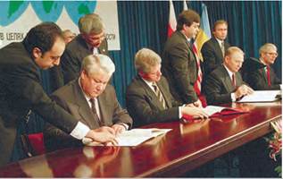 Ще напередодні Всеукраїнського референдуму 1 грудня 1991 р. Верховна Рада зробила урочисту заяву про без’ядерний статус України. У травні 1992 р. в Лісабоні Україна разом із делегаціями Росії, Білорусі та Казахстану — нових держав, які стали власниками успадкованої від СРСР ядерної зброї, — підписала протокол до договору між СРСР і США від 31 липня 1991 р. про скорочення та обмеження стратегічних наступальних озброєнь (СНО-1).
