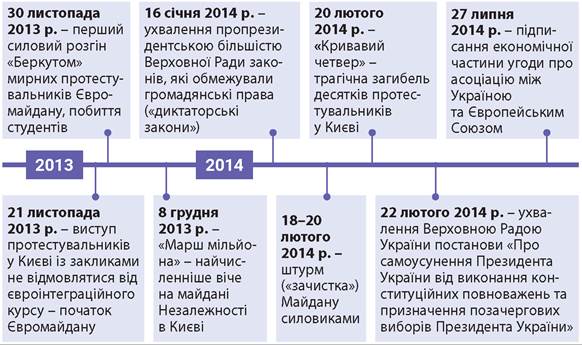 • «Кривавий четвер» — загибель пів сотні протестувальників — учасників Революції Гідності • позачергові президентські вибори, обрання П. Порошенка Президентом України • перше застосування сили для розгону мирних протестувальників Євромайдану • прийняття пропрезидентською більшістю ВР «диктаторських законів» • надання українцям і українкам права на безвізовий режим в’їзду до країн ЄС.