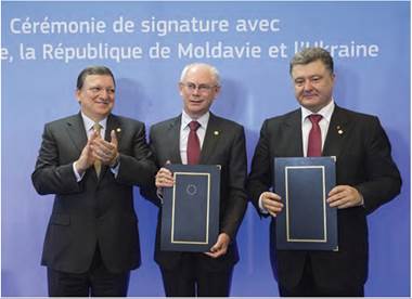 Президент Європейської комісії Жозе Мануел Баррозу, президент Європейської ради Герман Ван Ромпей і Президент України Петро Порошенко на церемонії підписання Угоди про асоціацію. 27 липня 2014 р.